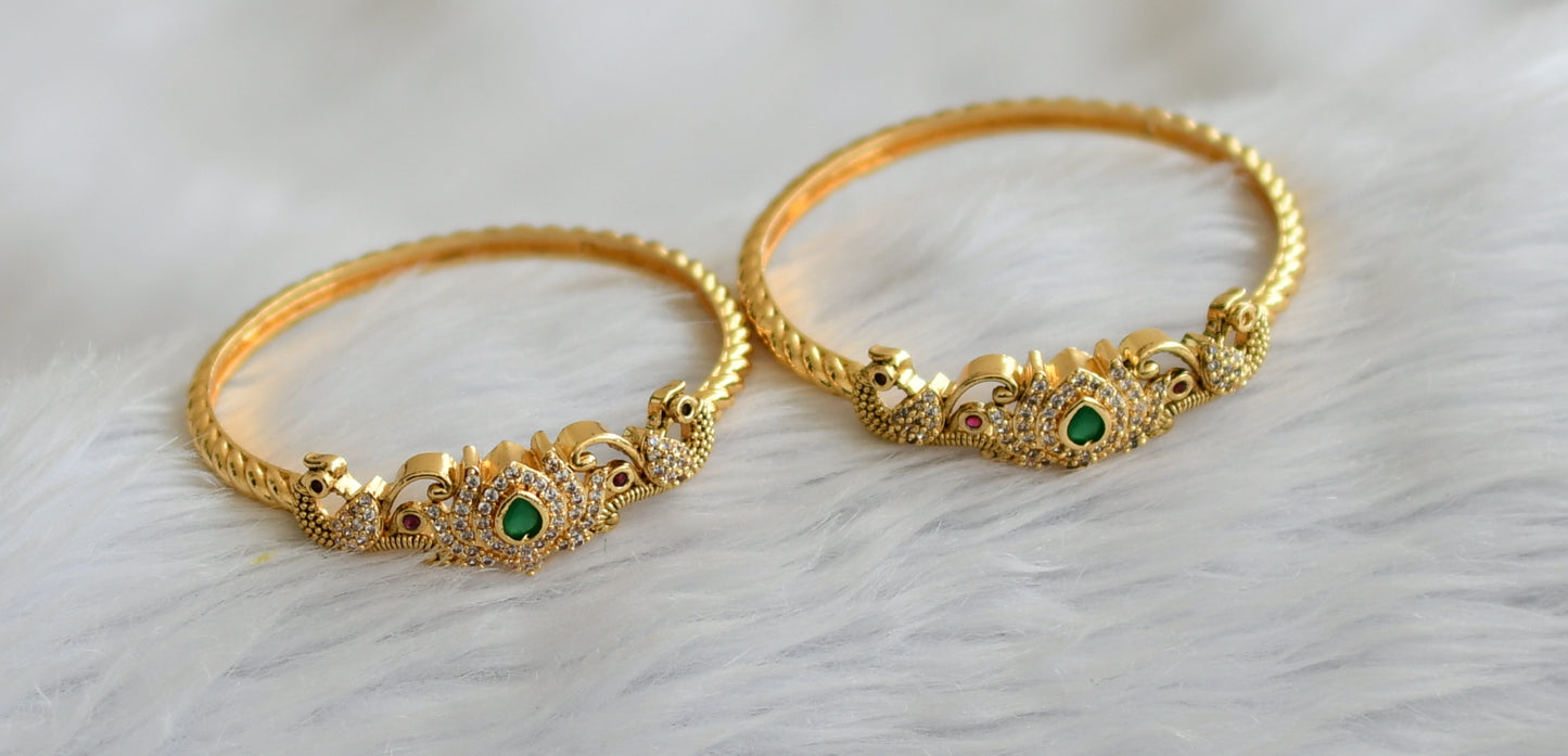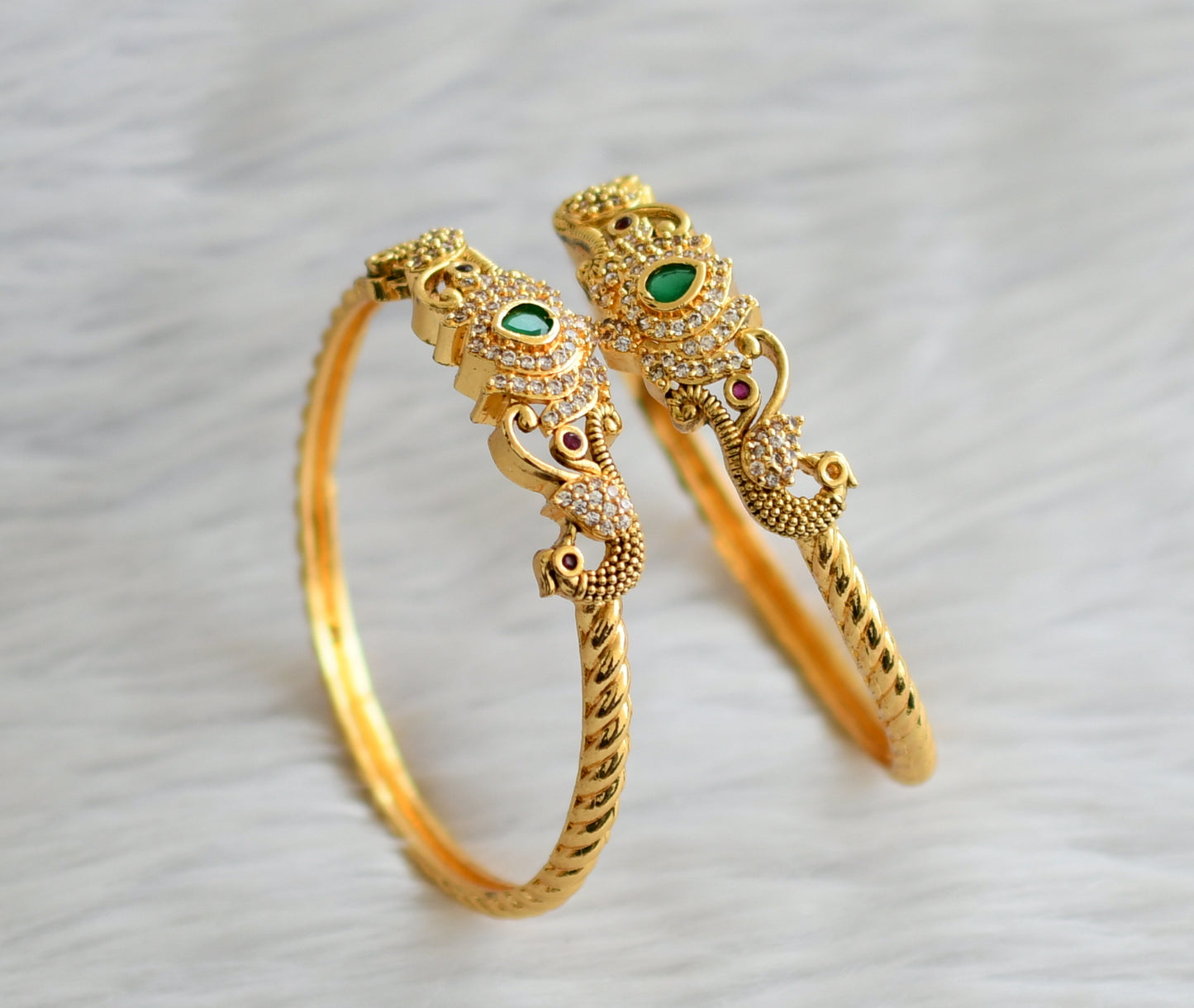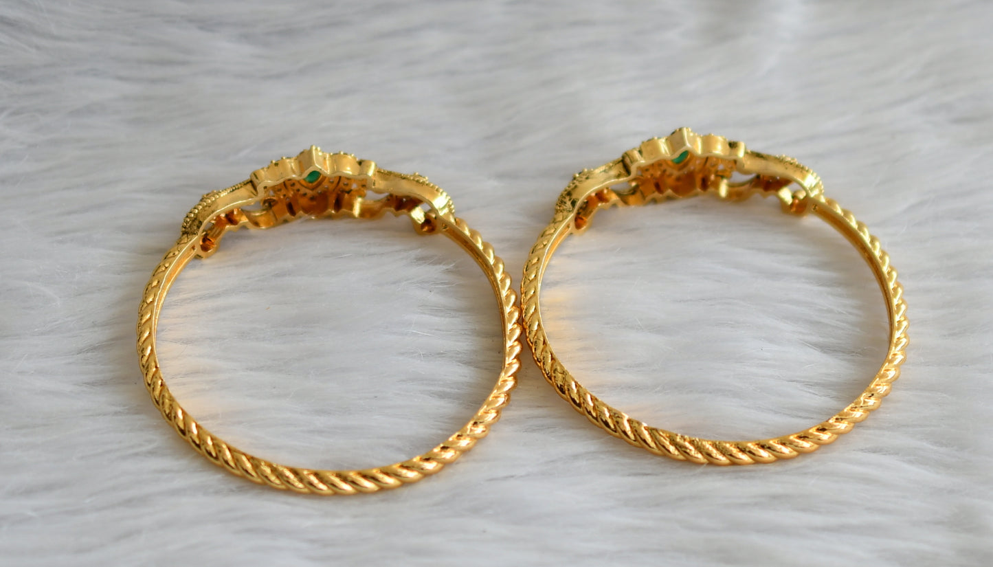 Gold tone ruby-green-white lotus peacock kada/bangles(2.8) dj-45782