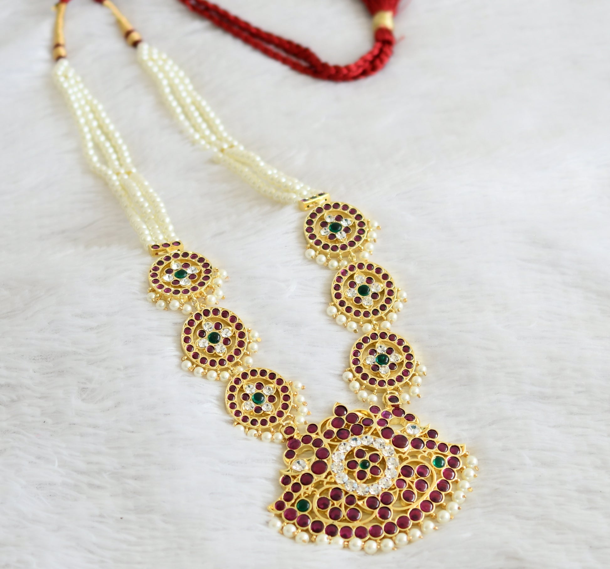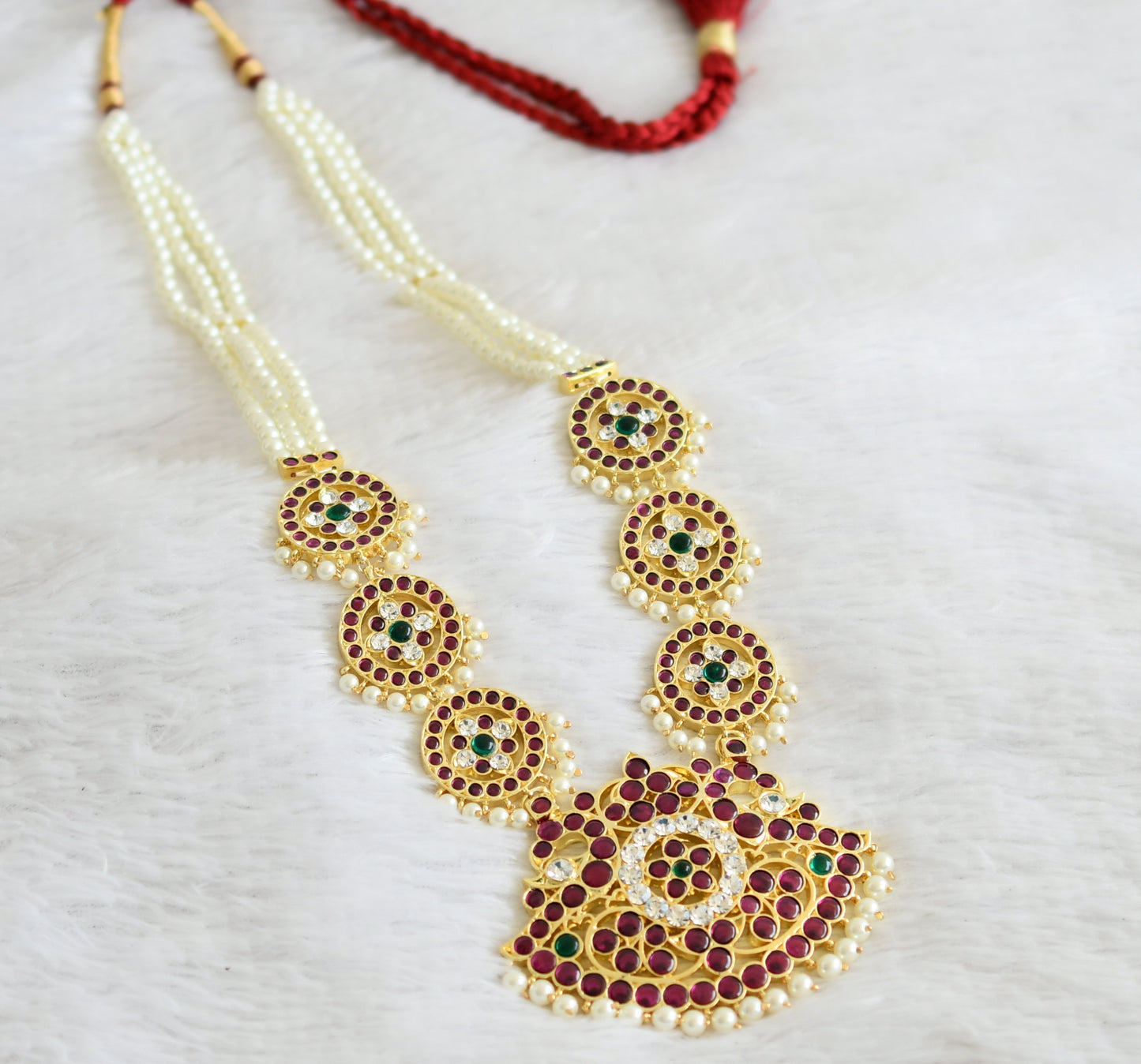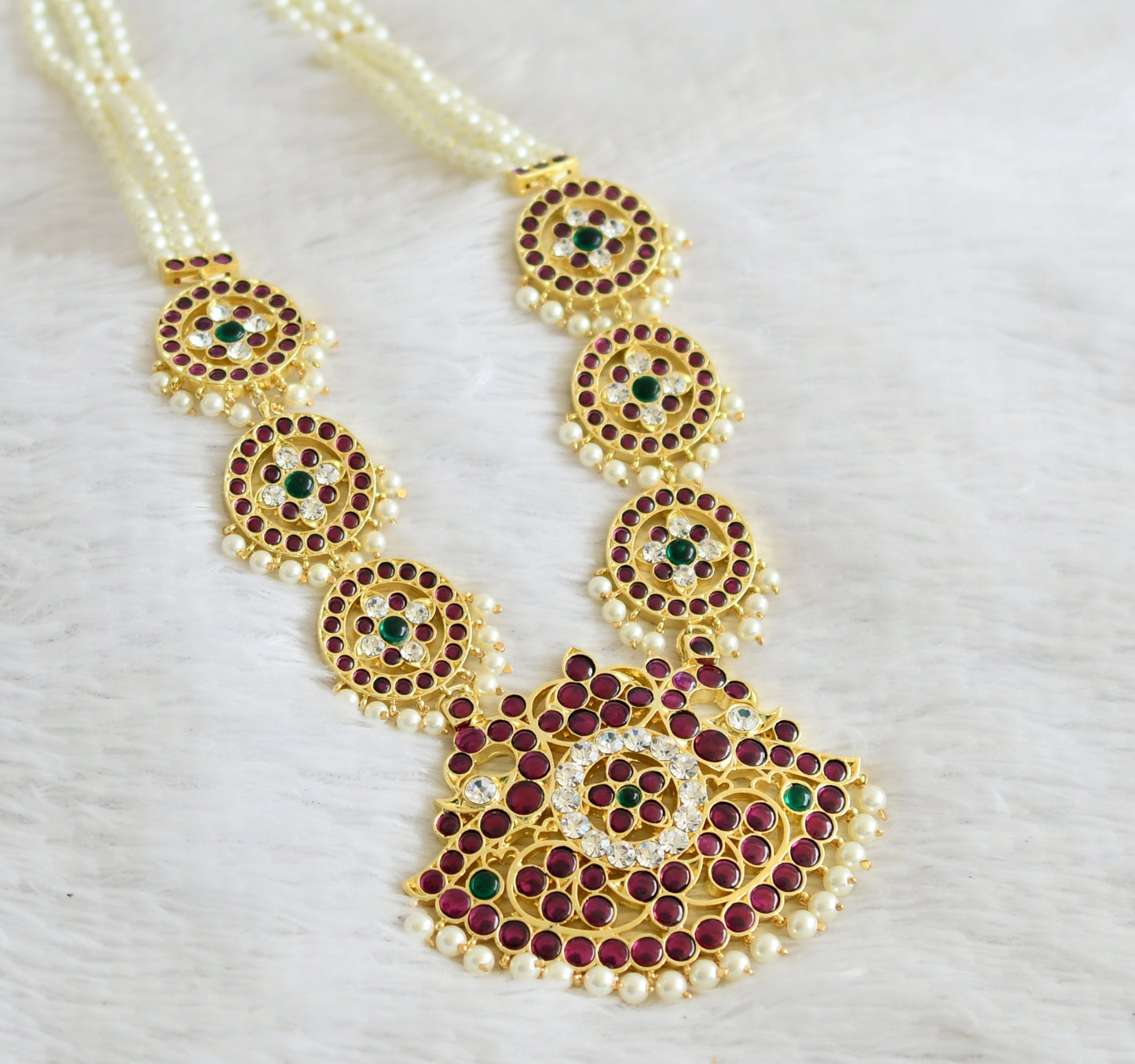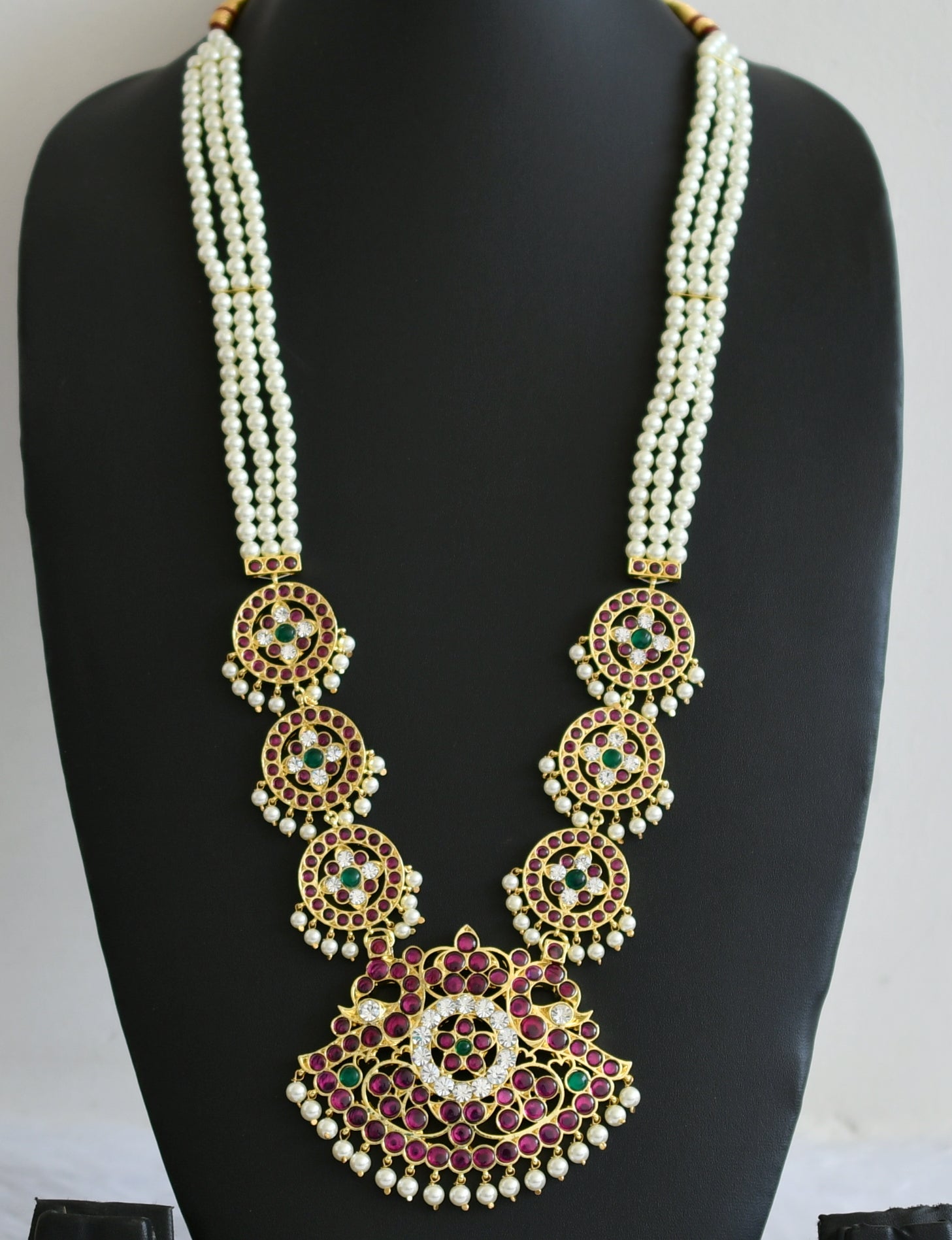 Gold tone semi precious kemp-green-white pearl beaded peacock haar dj-50531