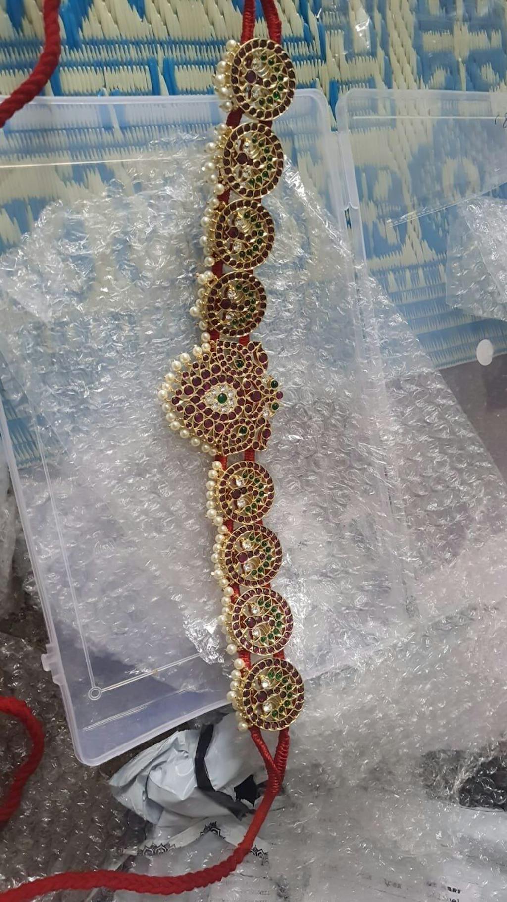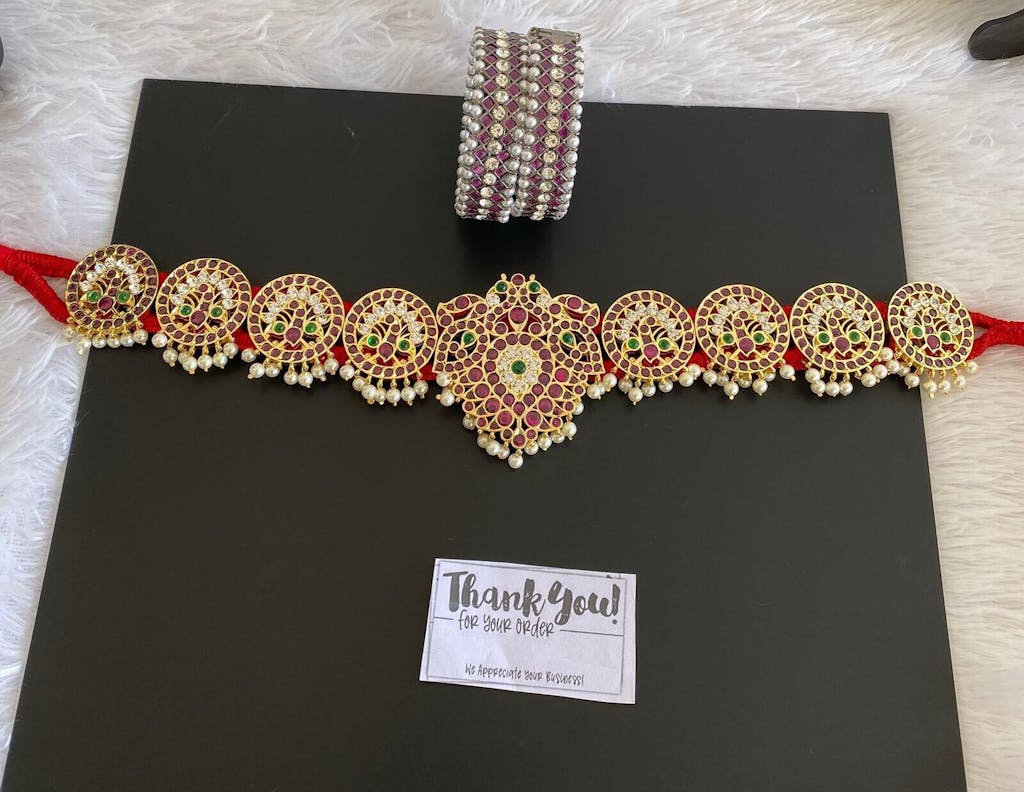 Please note that the stone arrangement in the belt in the second row of the peacock on either sides can be different from the pci in the website depending upon the stock we get from factory. Return request for this reason will not be accepted.