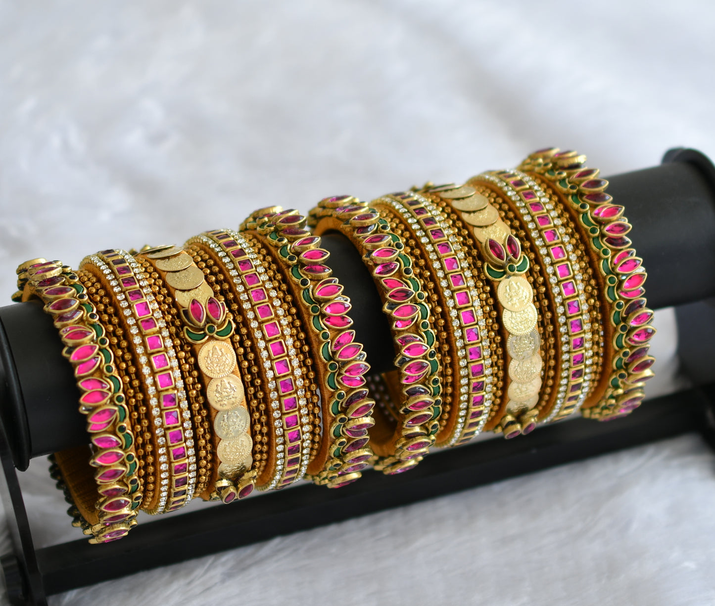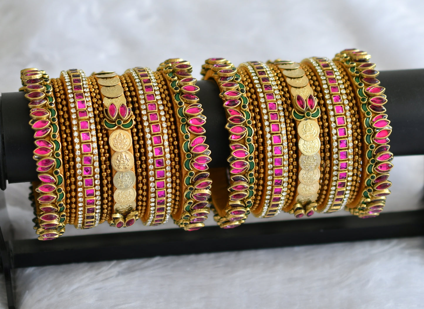 Gold tone silk thread pink-green-white kundan lotus lakshmi coin bangles(2.6) dj-46702