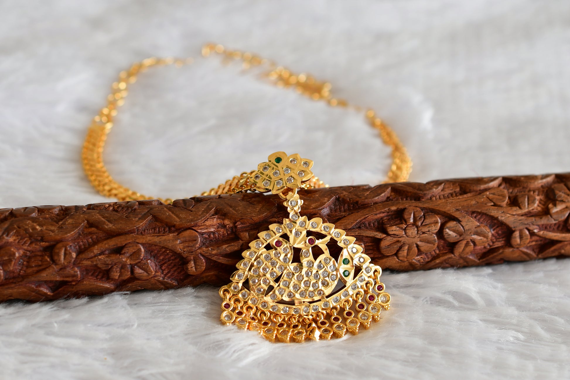 Gold tone south indian AD pink-green-white peacock attigai/necklace dj-51894