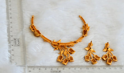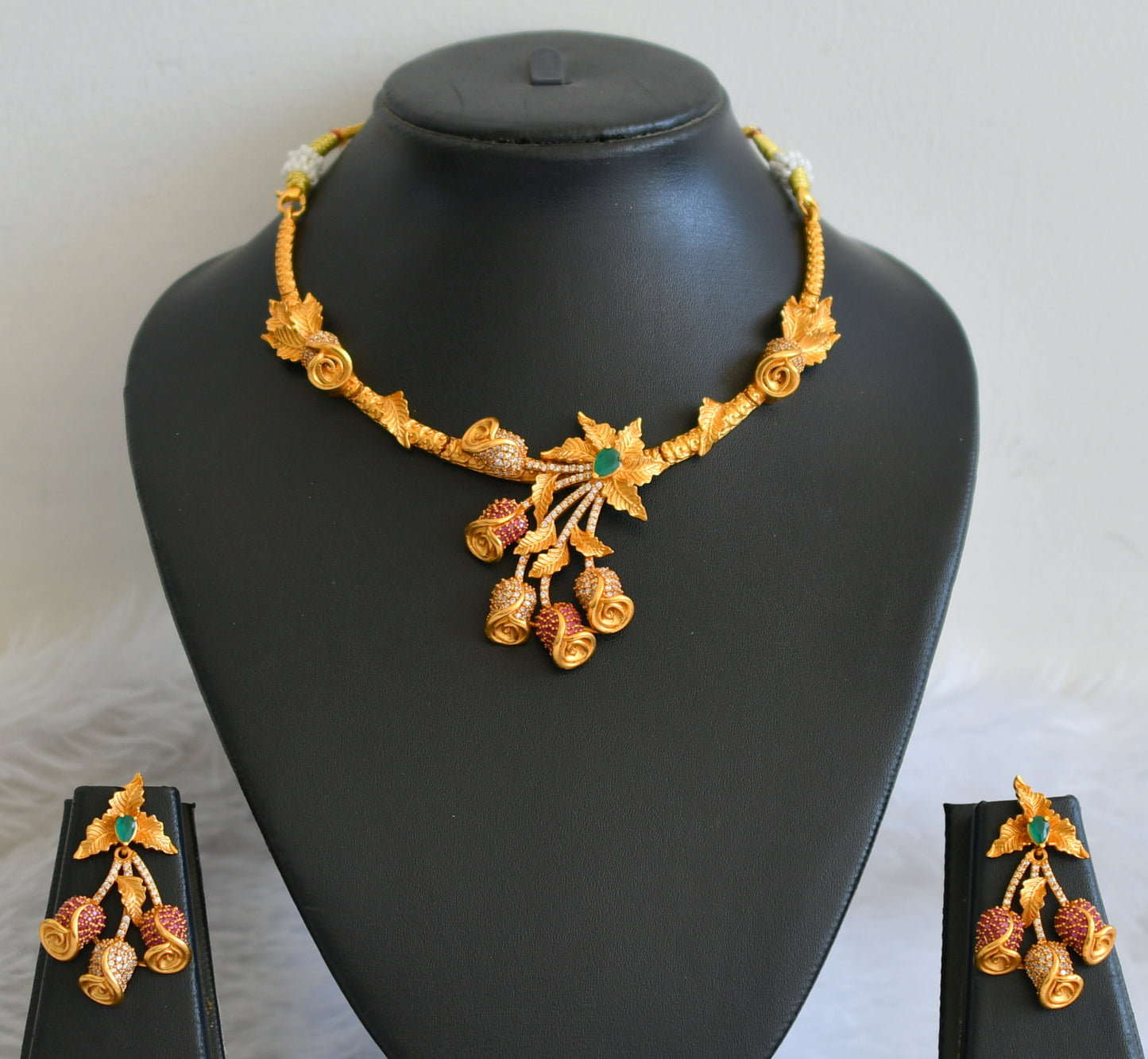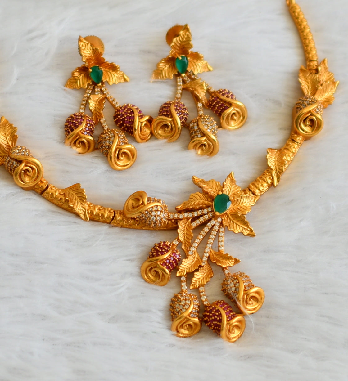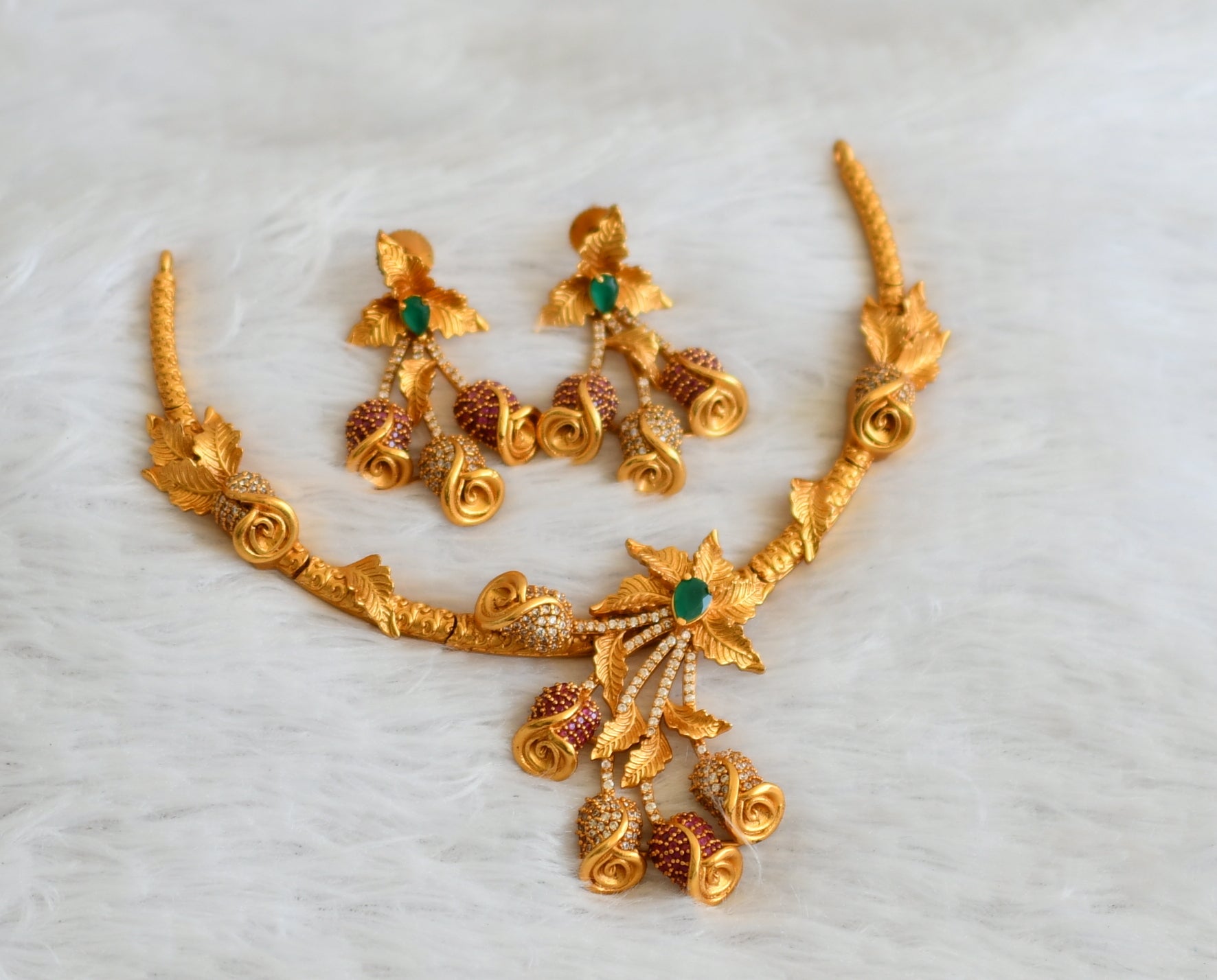 Matte finish cz ruby-green-white rose bud kante necklace set dj-30485