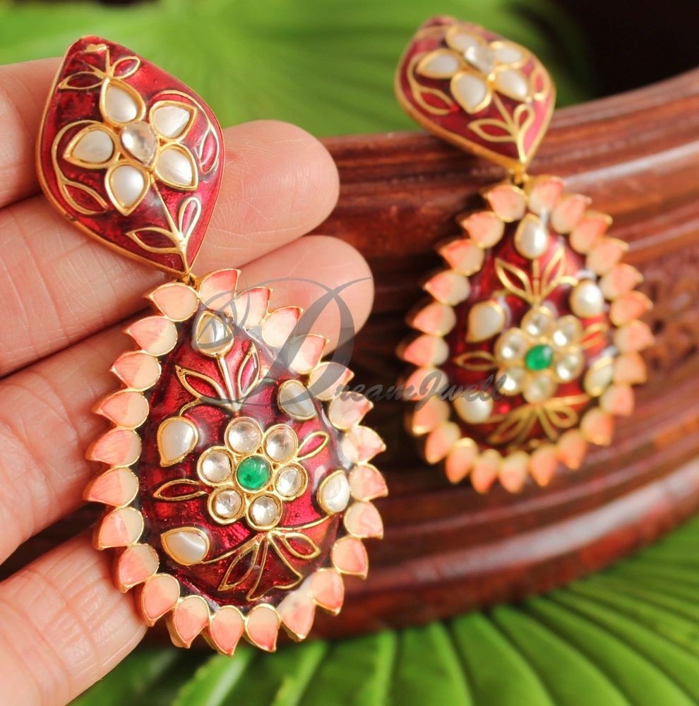 Antique Peach-Maroon Meenakari Kundan Designer Earrings-dj14554