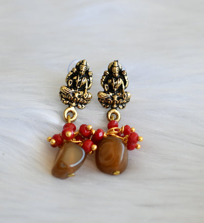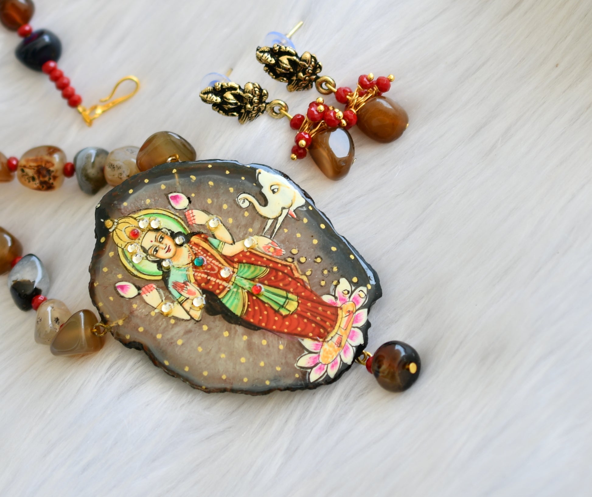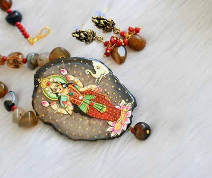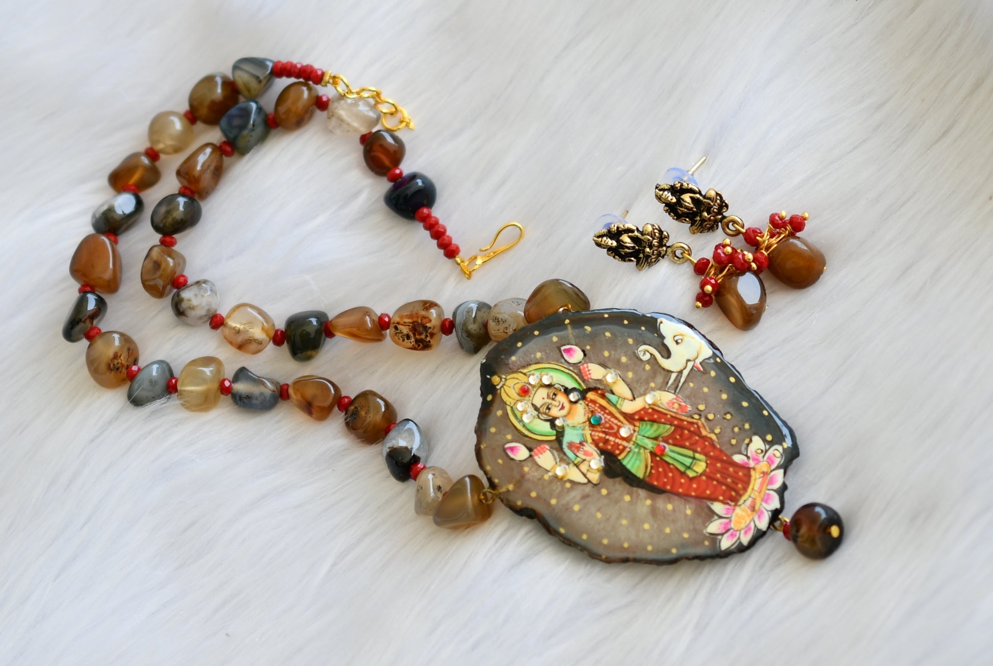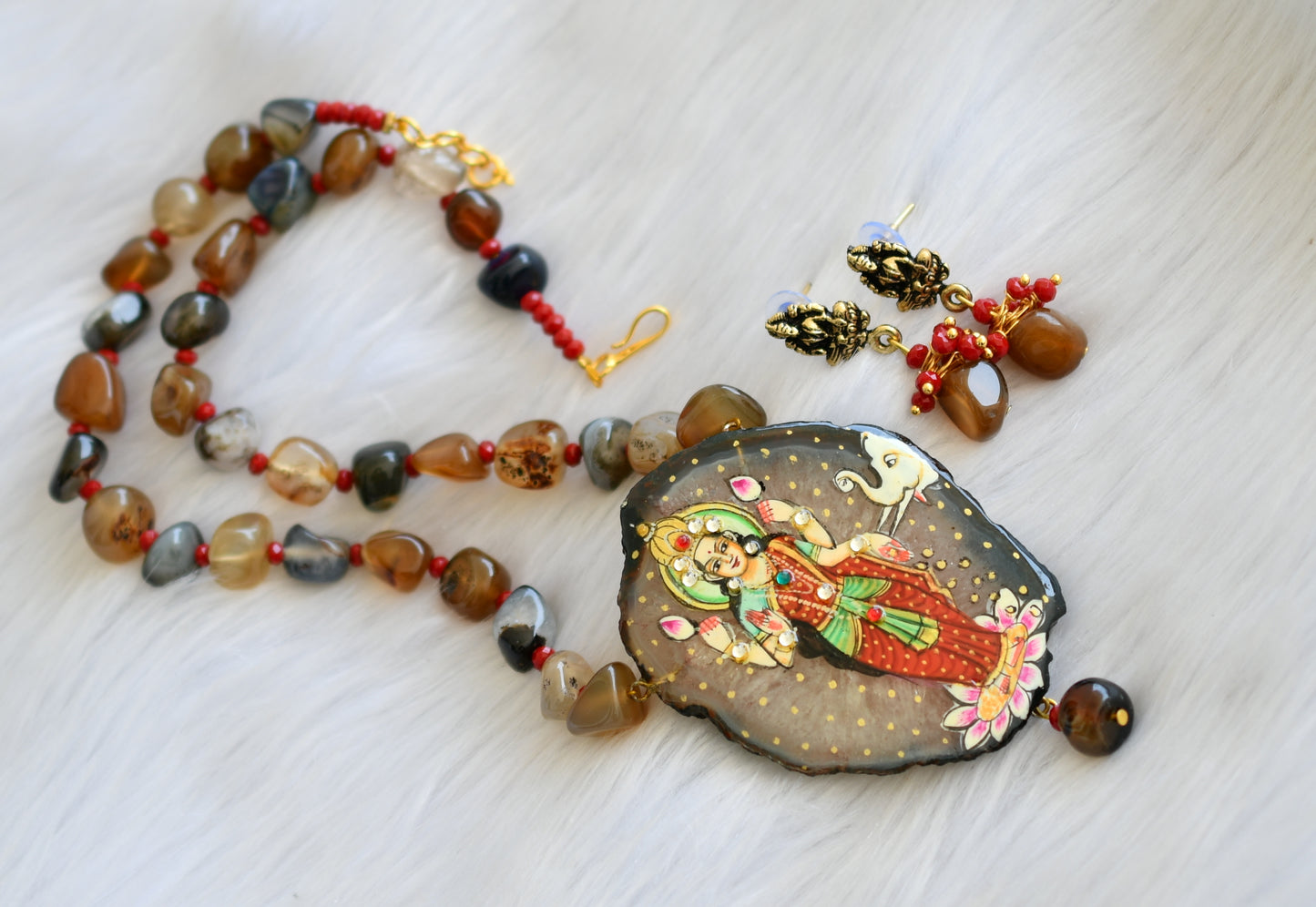 Hand painted Lakshmi sliced agate pendant with brown-black-white onyx beads necklace set dj-39928