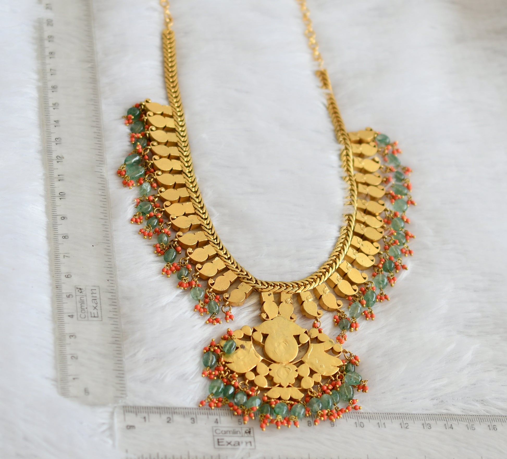 Matte finish carved coral-white kundan jadau green beaded mango necklace dj-50251