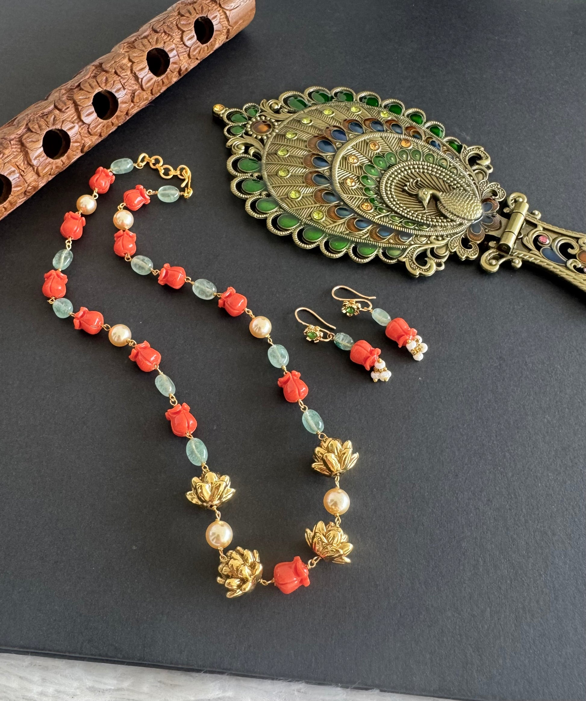 Matte finish coral-green-pearl lotus beaded necklace set dj-52084