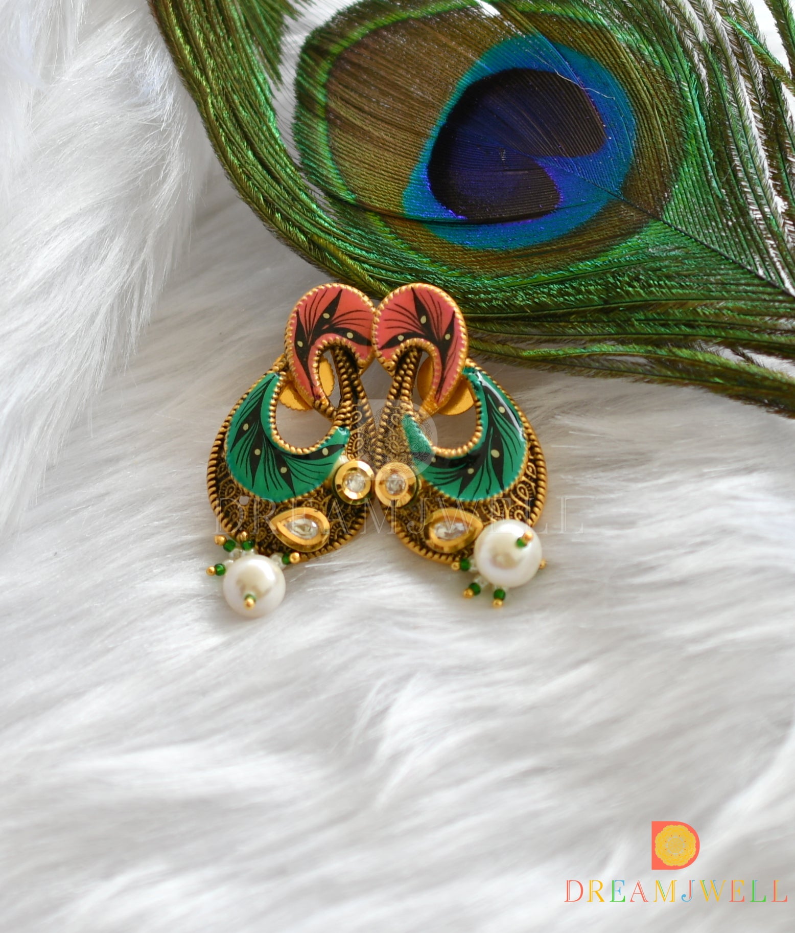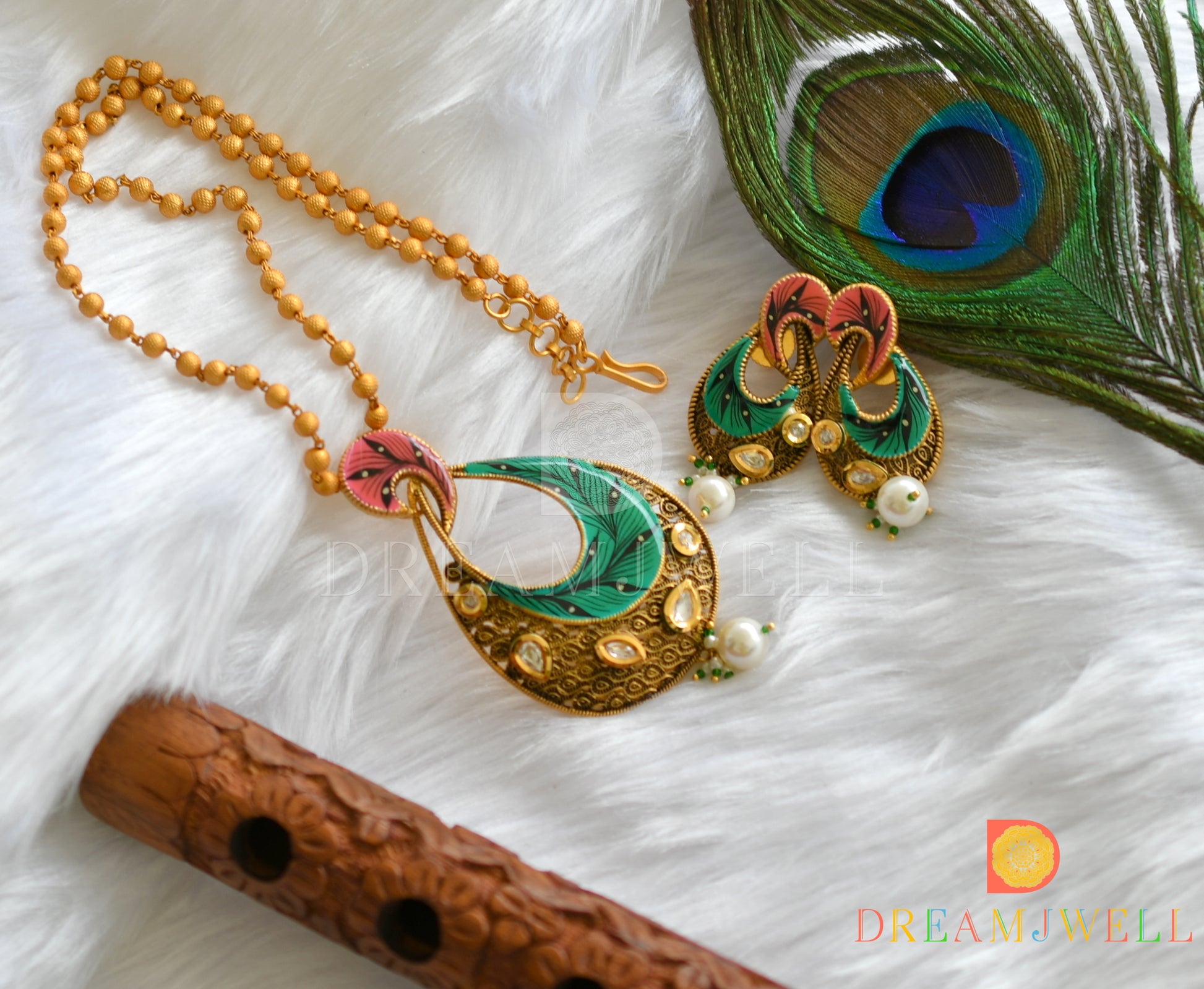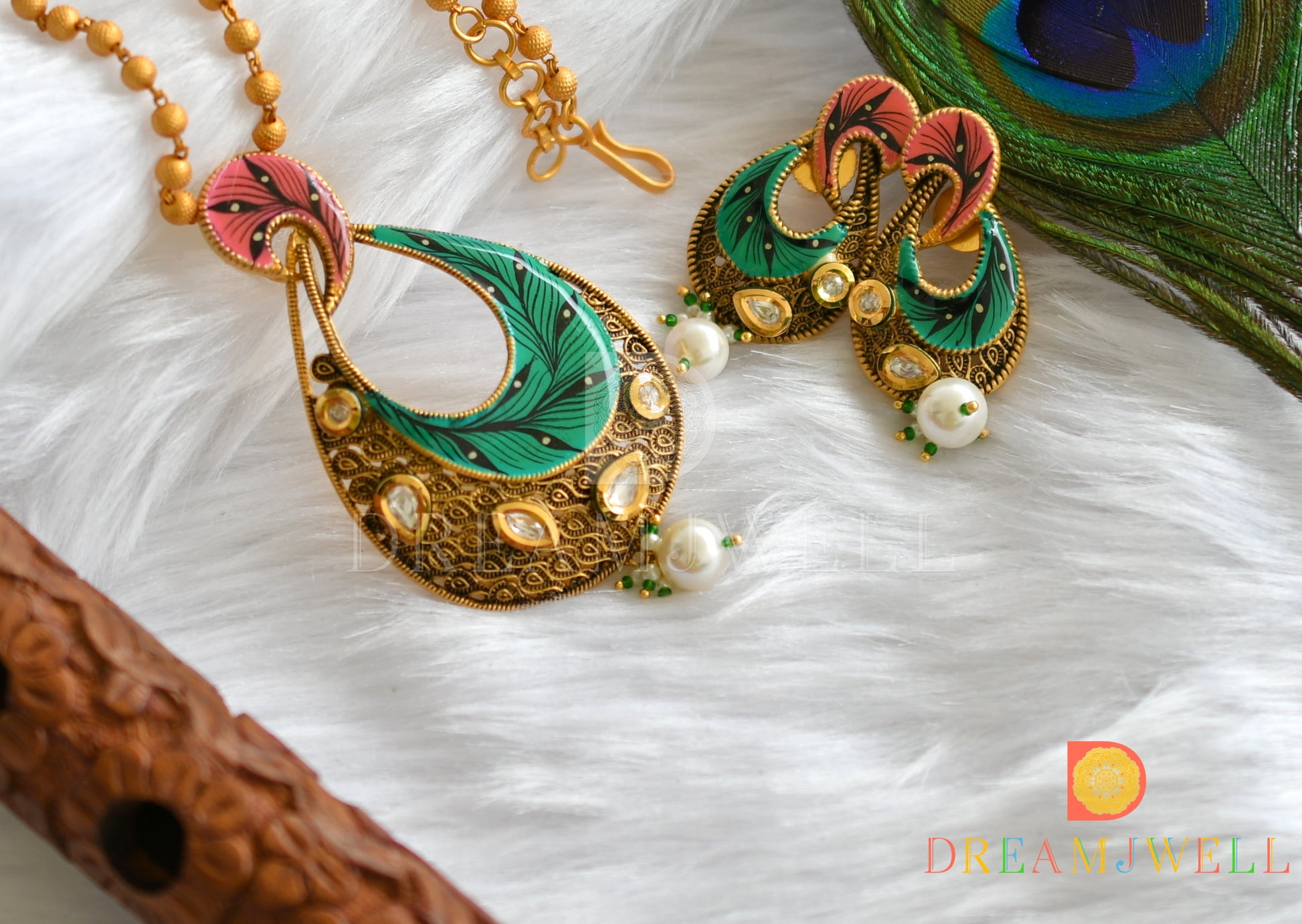 Matte finish kundan white-green-pink hand painted pendant set dj-37467