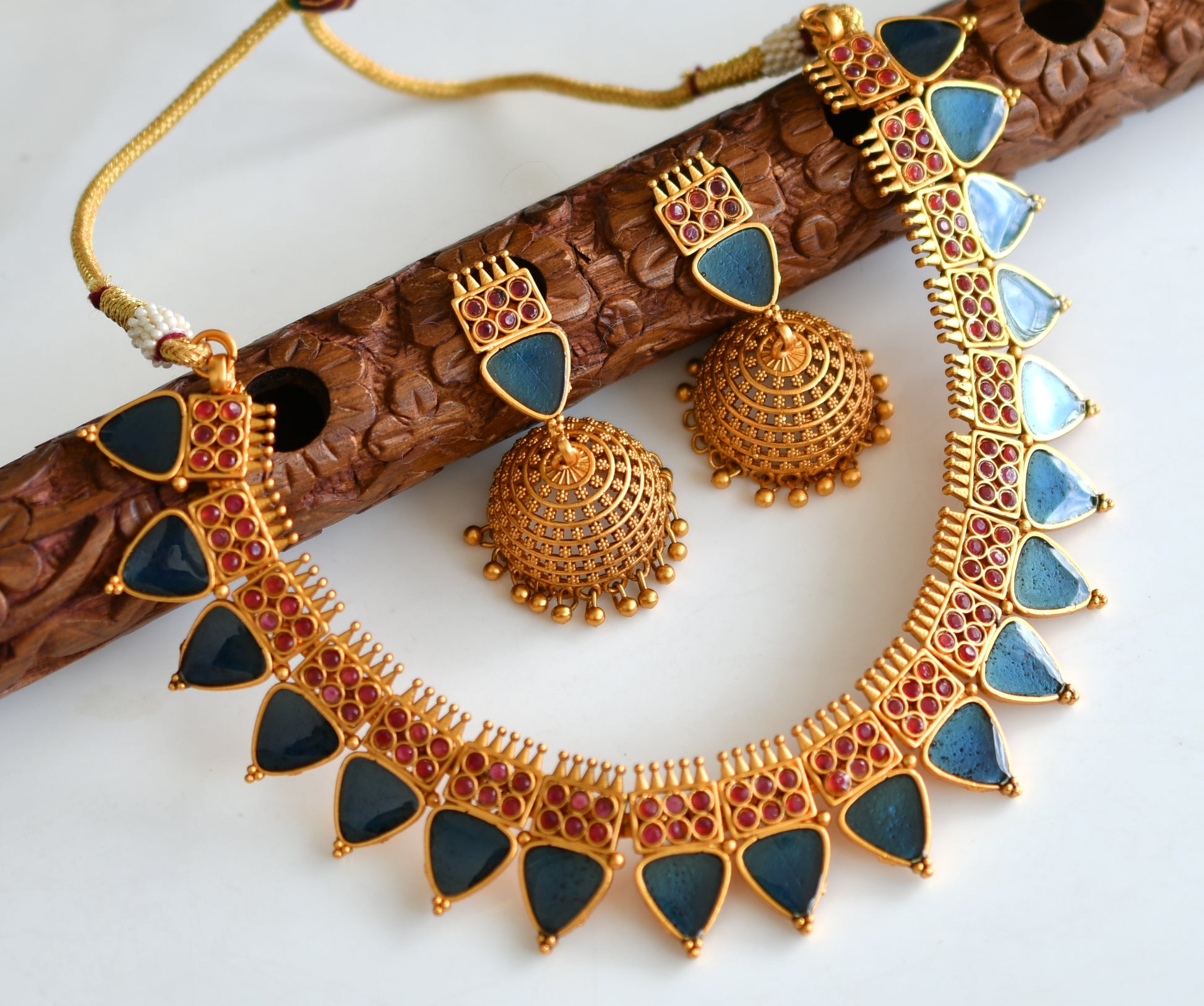 Matte finish Kerala style Maroon-blue necklace set dj-42811