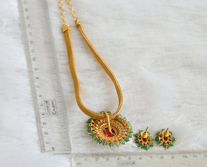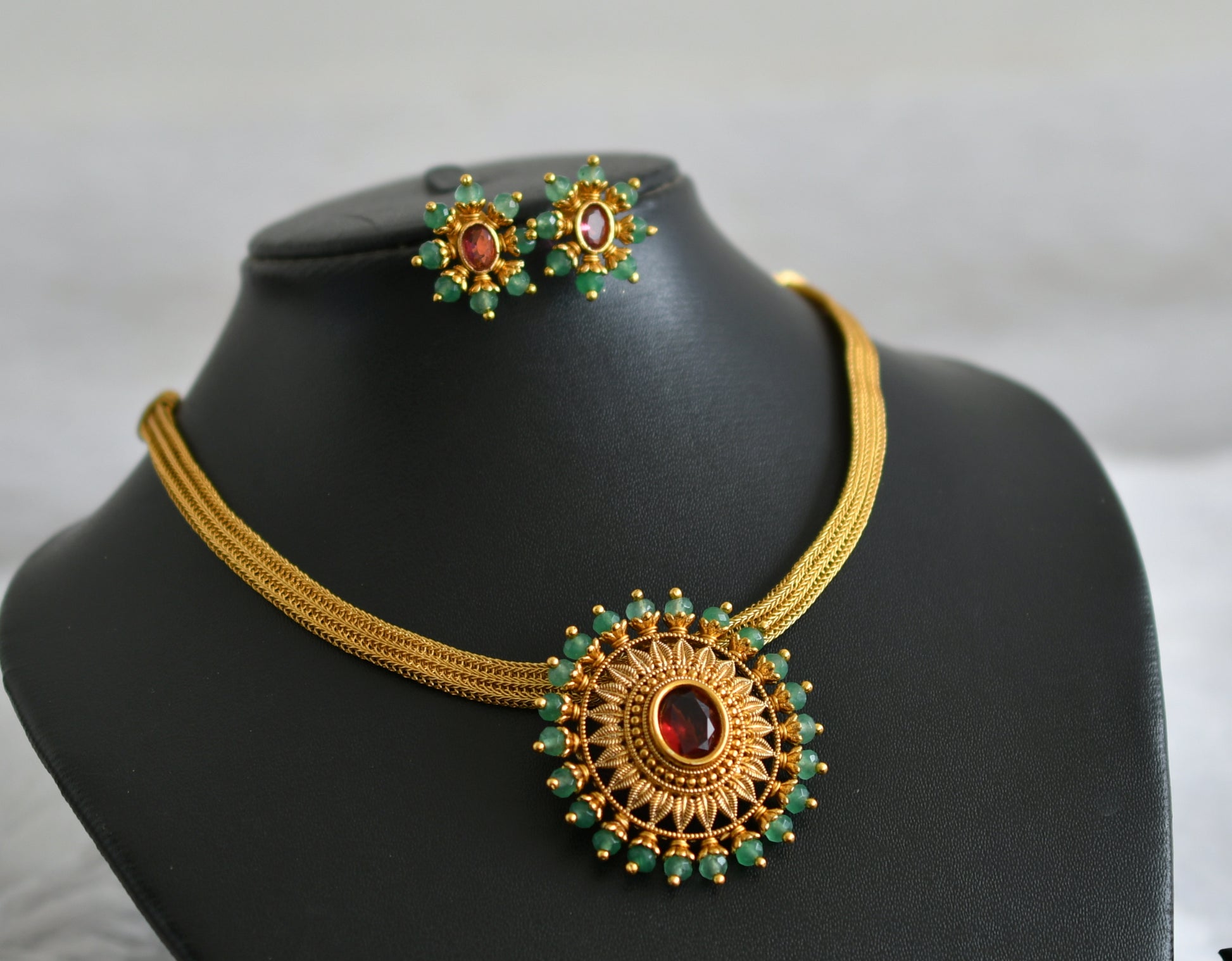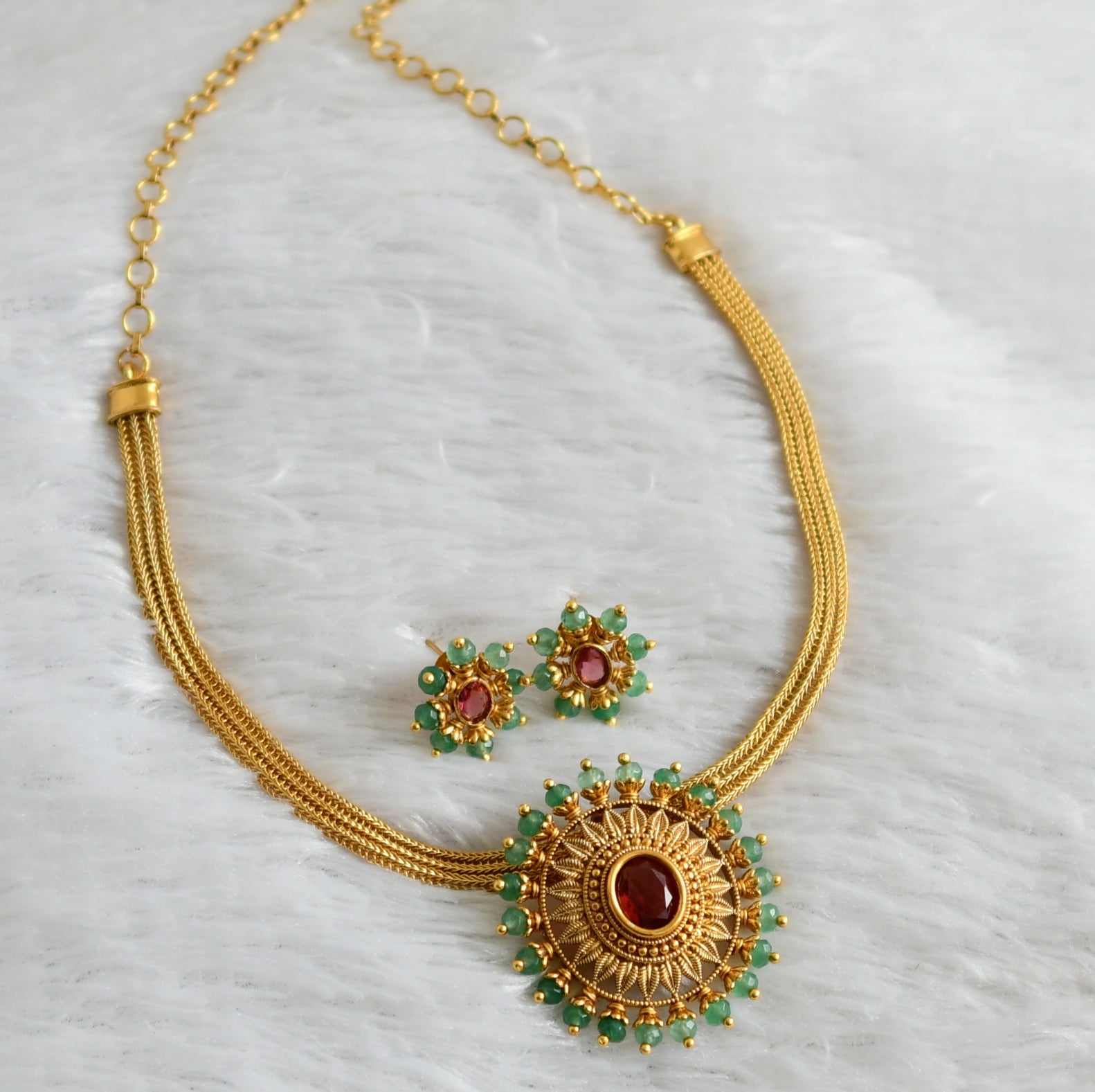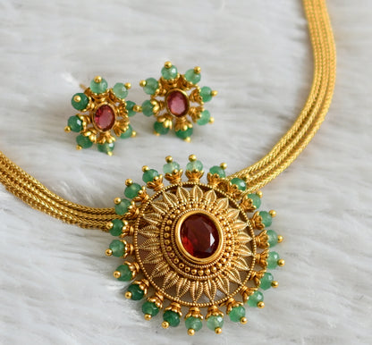 Matte finish magenta pink-sea green beaded oval stone necklace set dj-47967