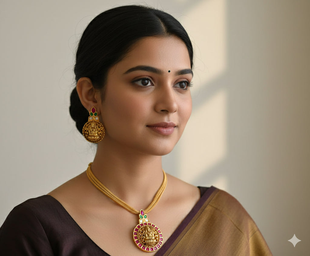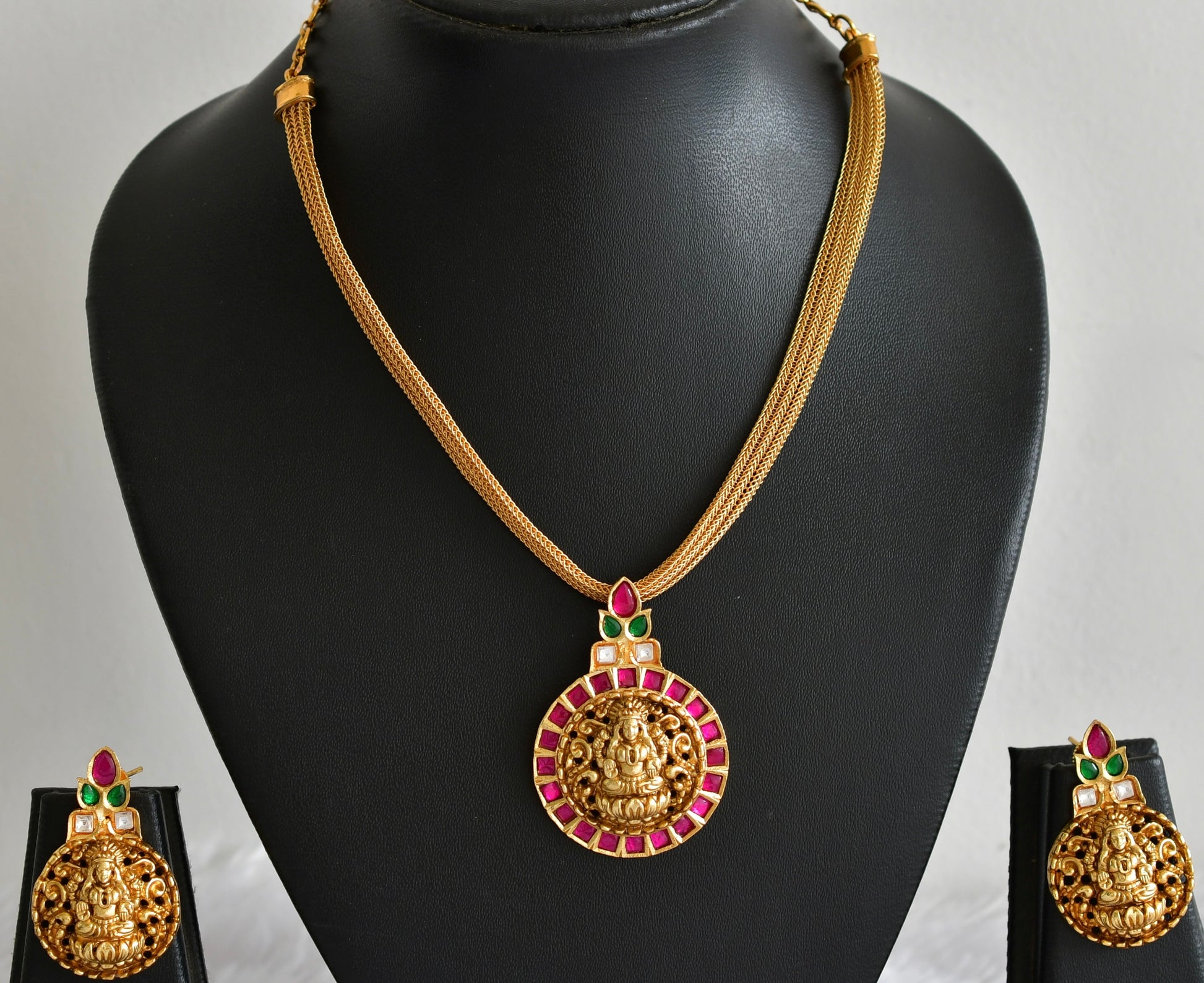 Matte finish pink-green jadau Lakshmi pendant necklace set dj-51821