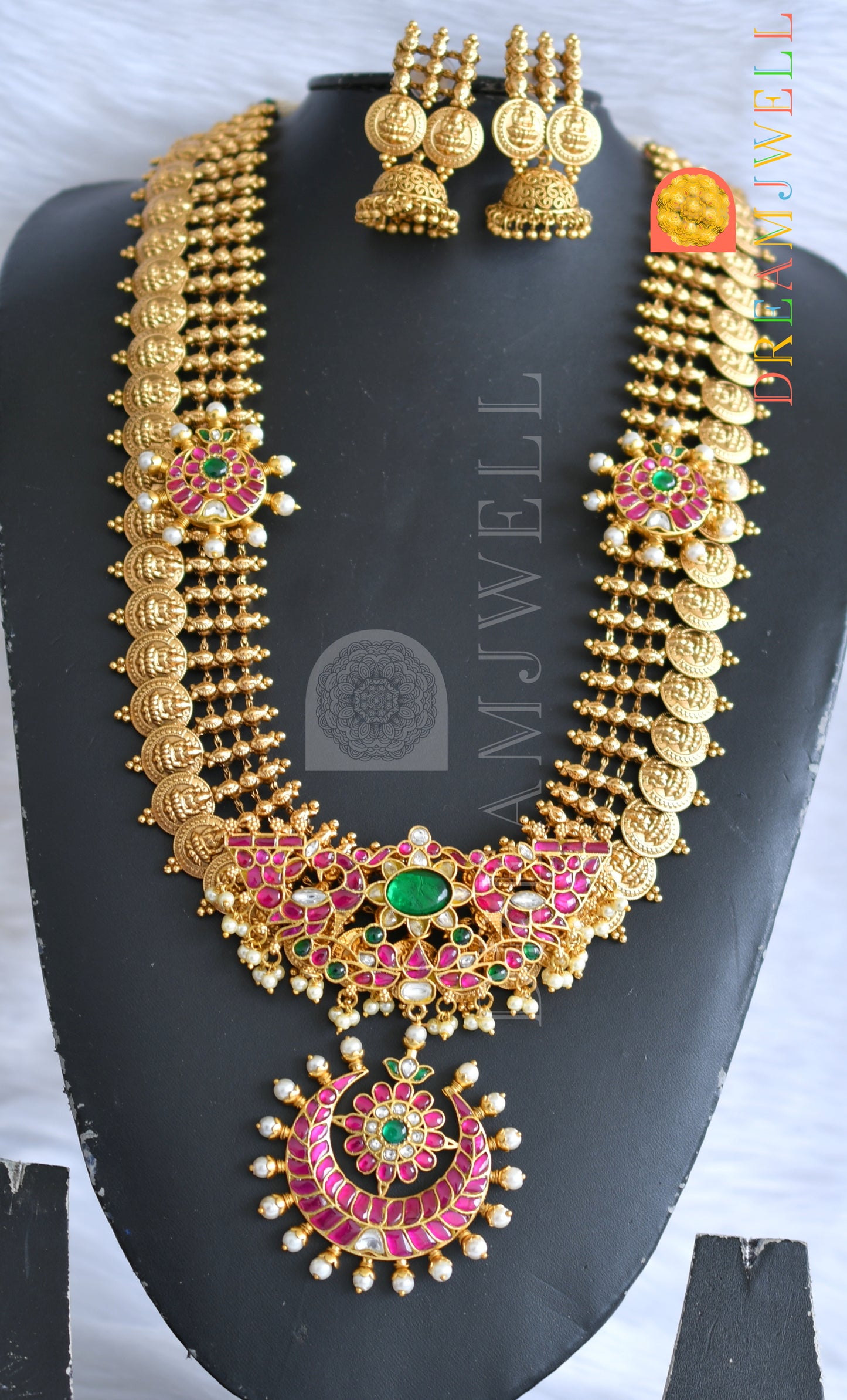 Matte finish pink-green-white kundan jadau Lakshmi coin-Moon haar set dj-38176