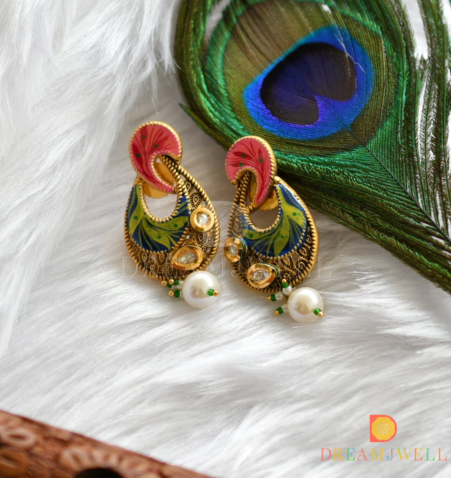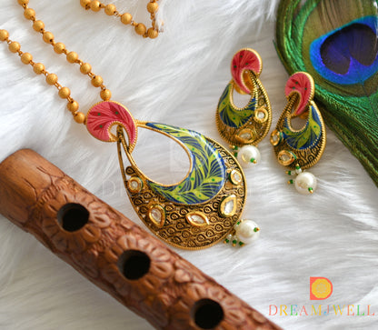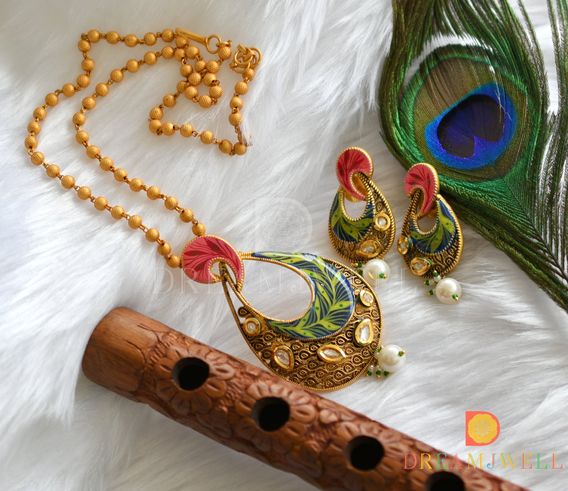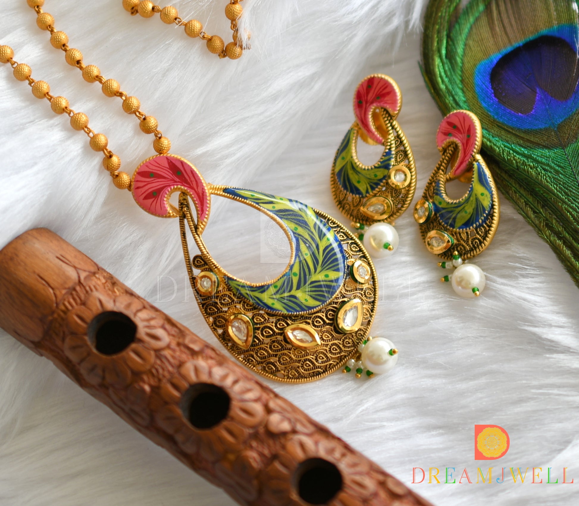 Matte finish kundan white-pink-blue-green hand painted pendant set dj-37468