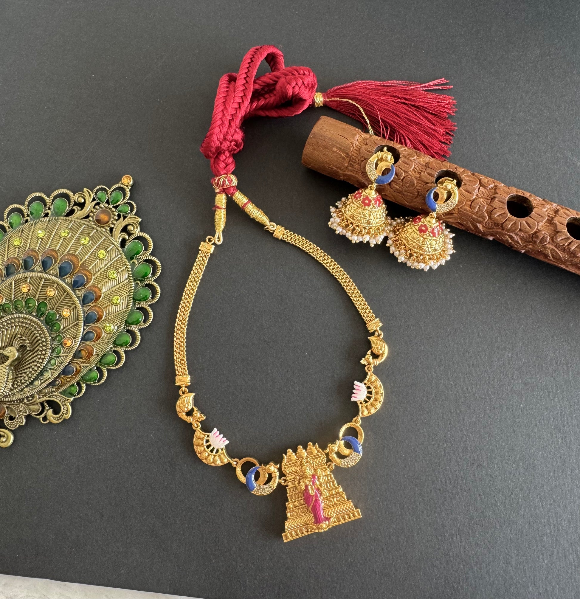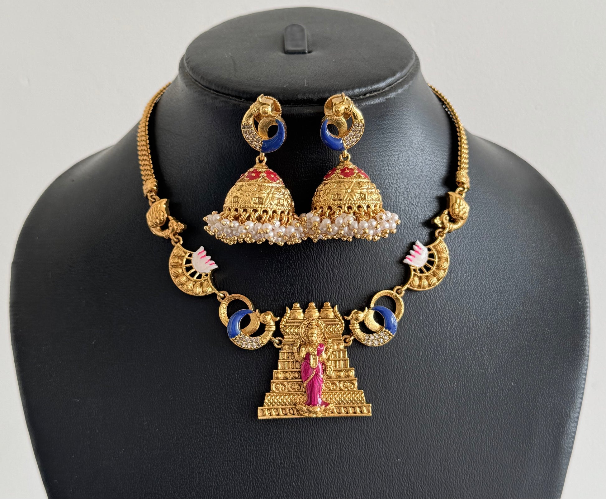 A beautifully designed gold replica design necklace of Ma Meenakshi in Gopuram intricately carved and decorated with Meenawork.