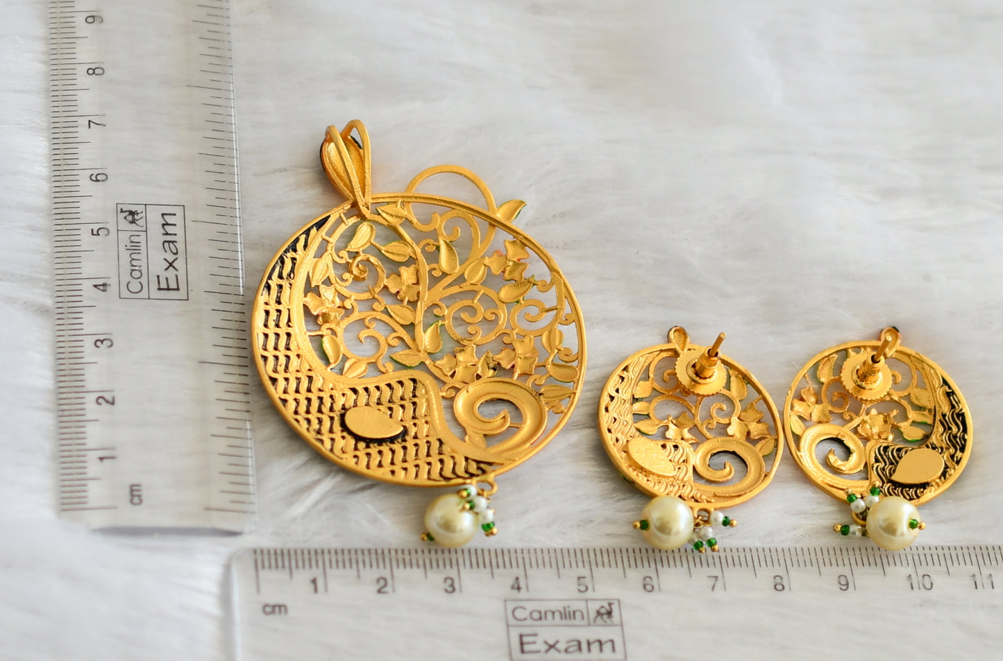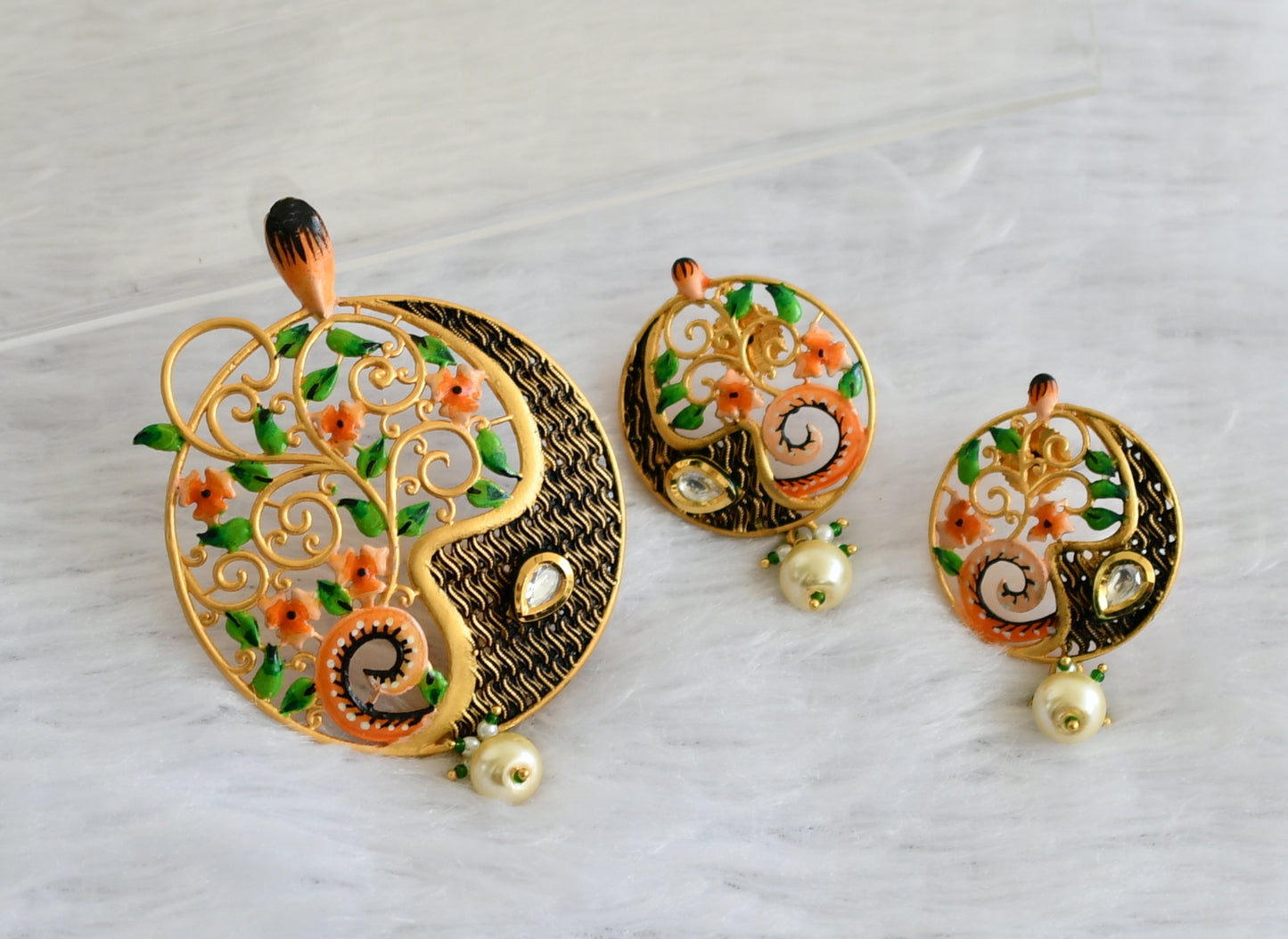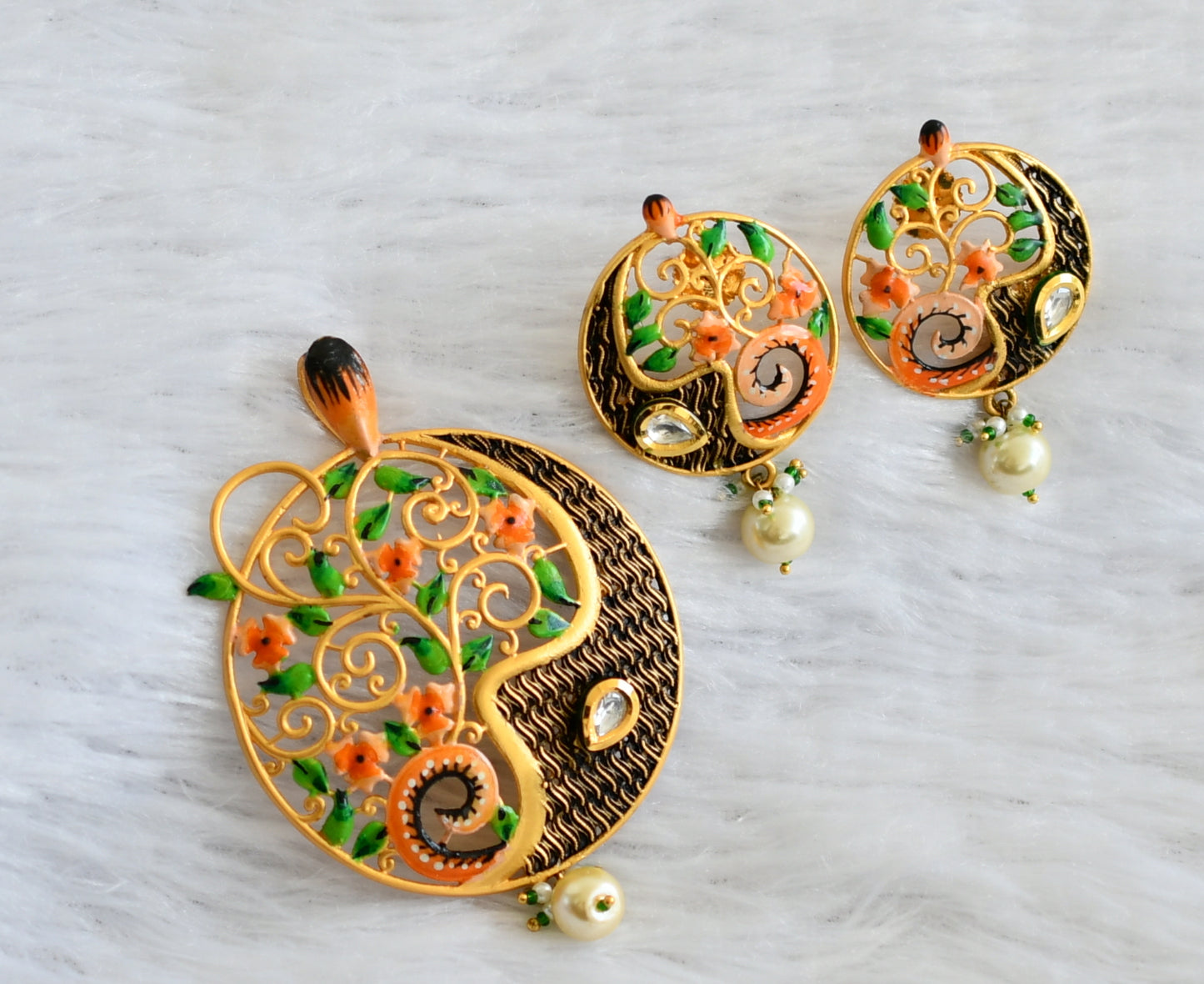Matte Finish Orange-green Meenakari flower Pendant Set-dj09151