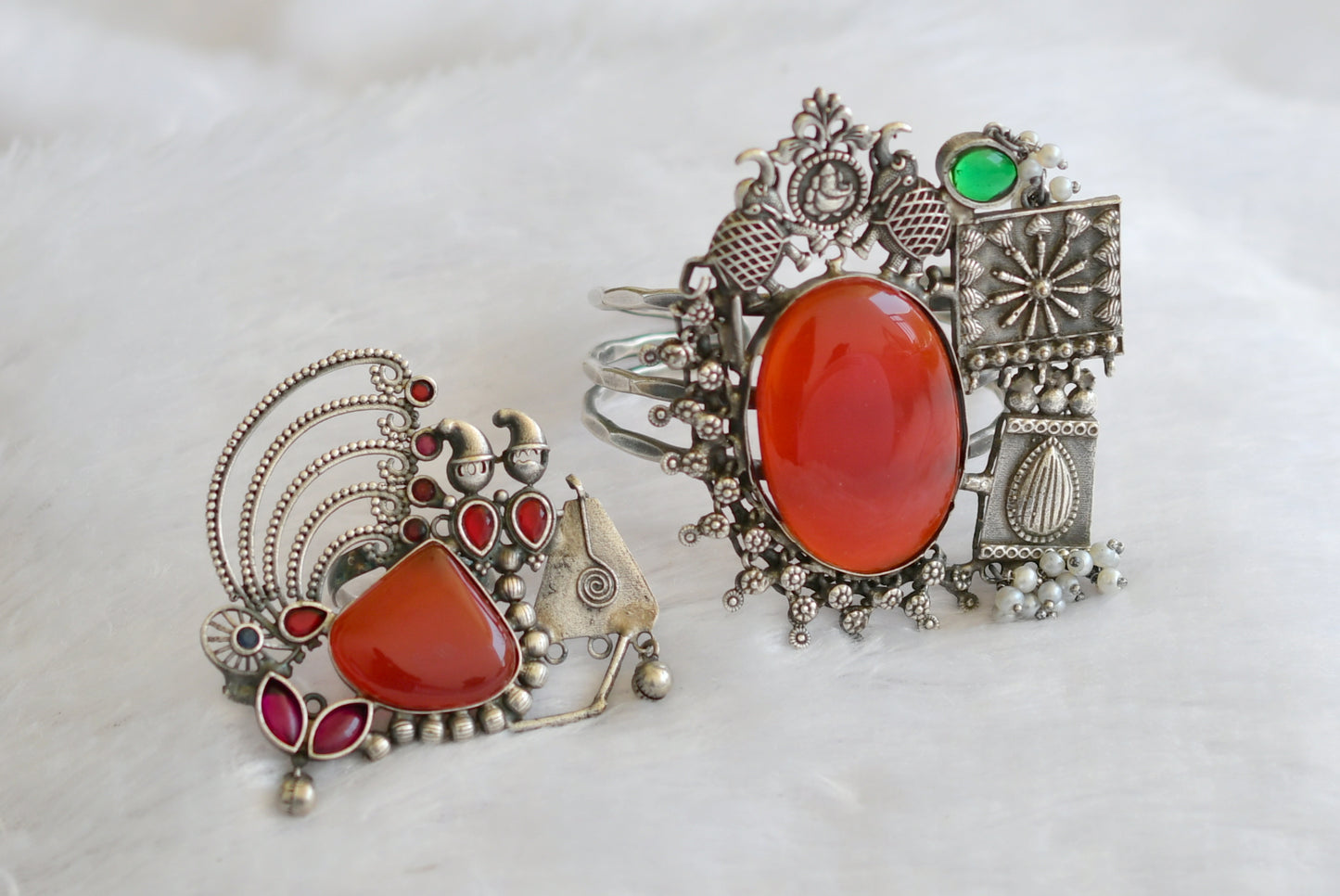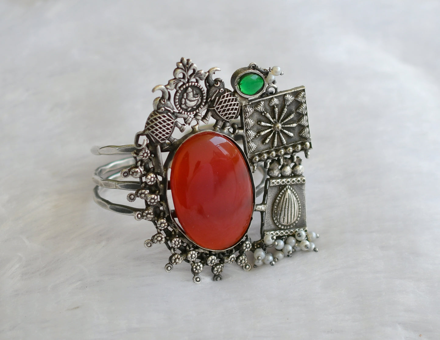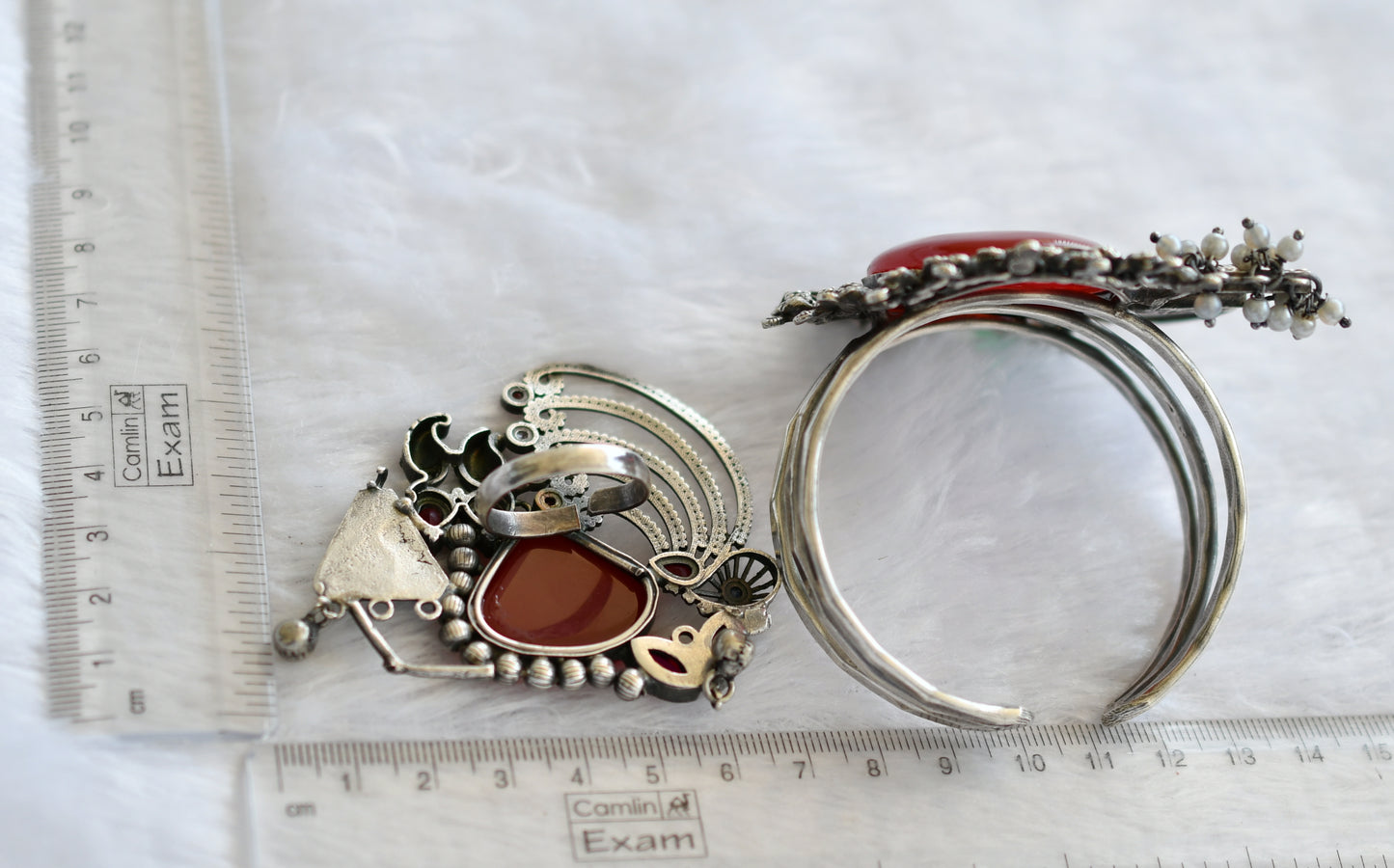 Silver tone red stone big bracelet with adjustable finger ring dj-46430