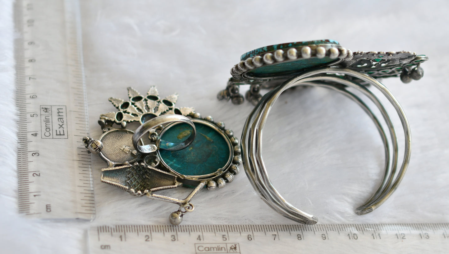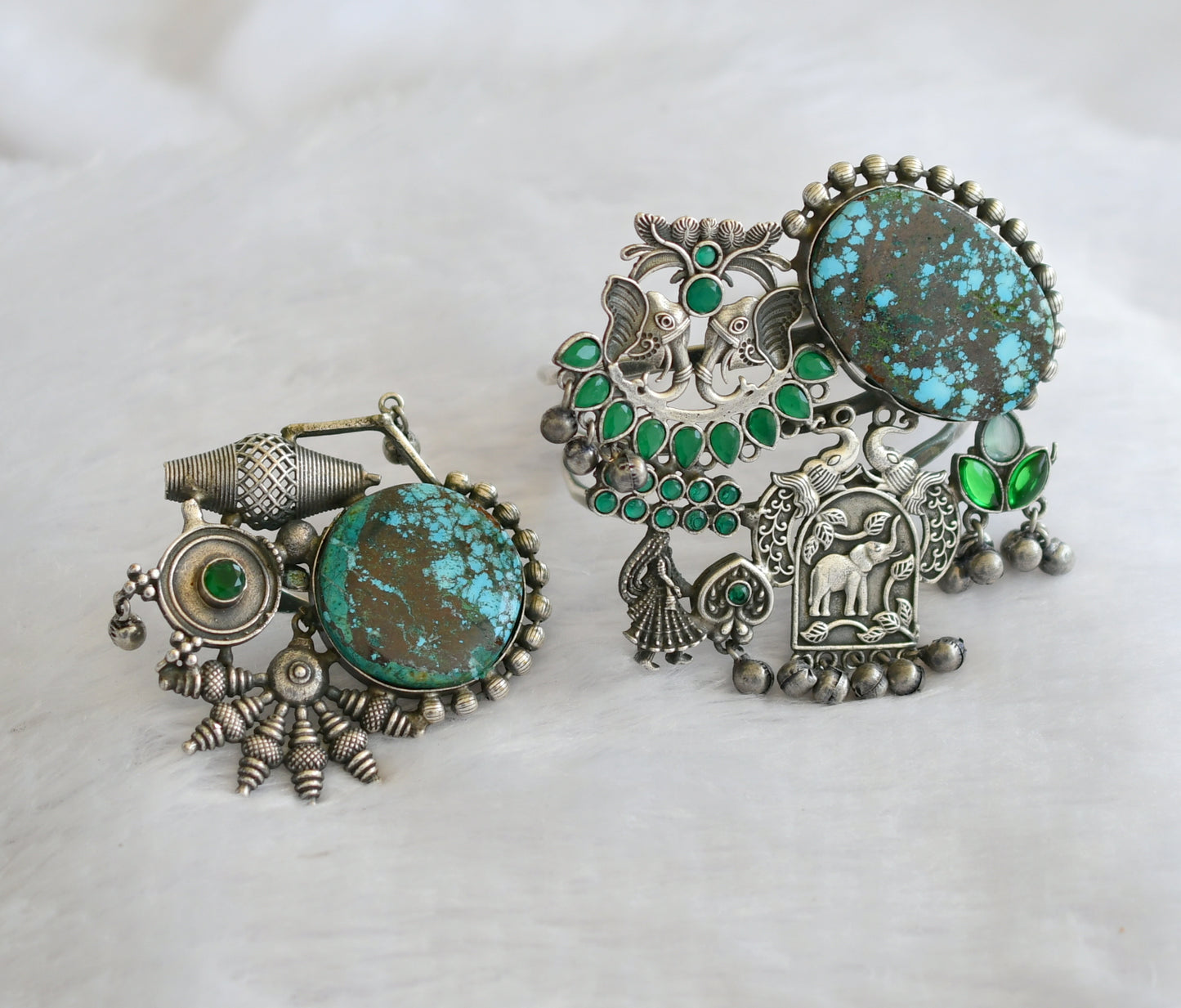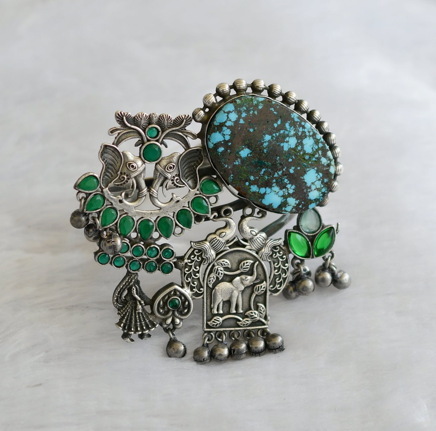 Silver tone turquoise blue stone big bracelet with adjustable finger ring dj-46431