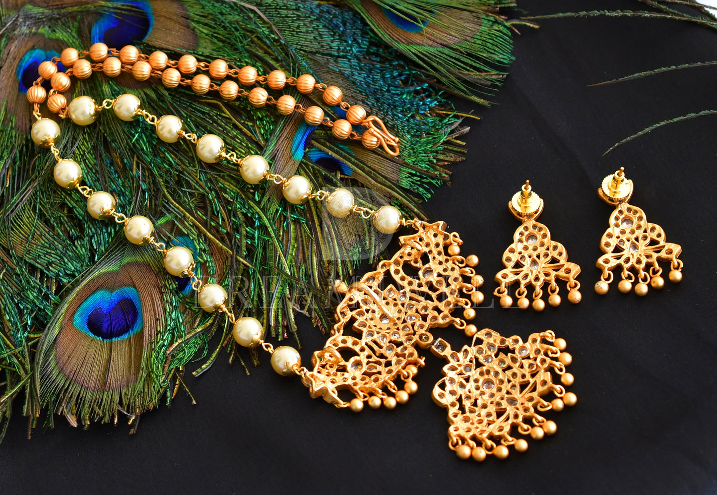 Matte Finish Cz Peacock Pendant Pearl Necklace Set-dj08827